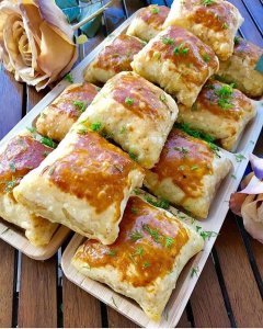 Kesilen eş parçaların orta kısmına sebzeli harcımızı koyup boça şeklini verip yağlı kağıt serili